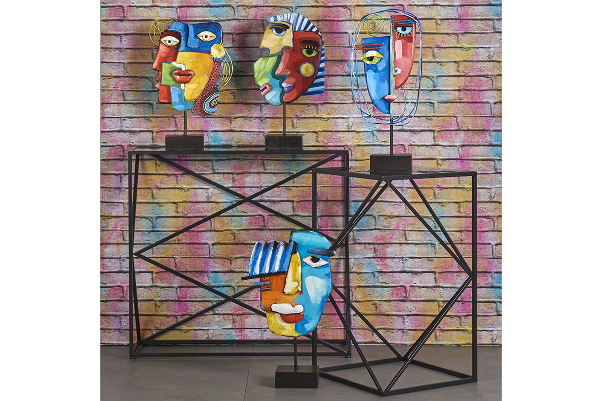 Cette sculpture visage métal représente plusieurs visages entremêlés, laissant apparaître le Némès, la coiffe emblématique des pharaons. L’artiste peintre sculpteur façonne LES IMBROGLIOS pour créer des pièces artistiques exclusives aux riches couleurs.