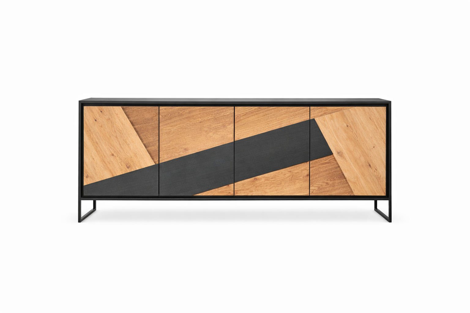 Le bahut GRAFFIK 4 portes teinte noir et bois avec pieds en métal et option LED allie modernité et fonctionnalité pour s’intégrer parfaitement dans n’importe quelle pièce de votre maison.