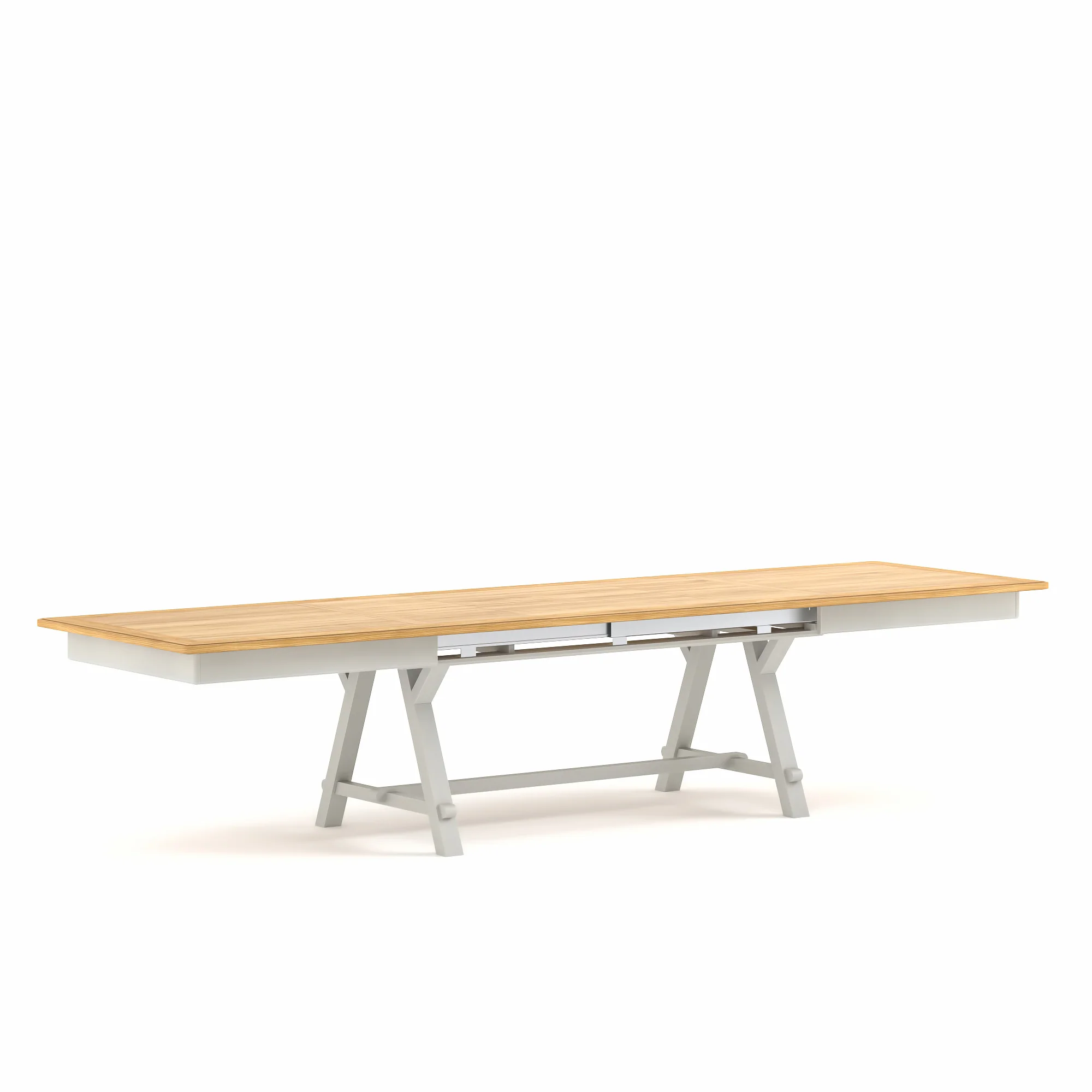 Dessus et allonges : Ă©paisseur 27 mm, panneaux centraux en mĂ©dium plaquĂ© chĂȘne rainurĂ©s tous les 13 cm, rives en chĂȘne massif.