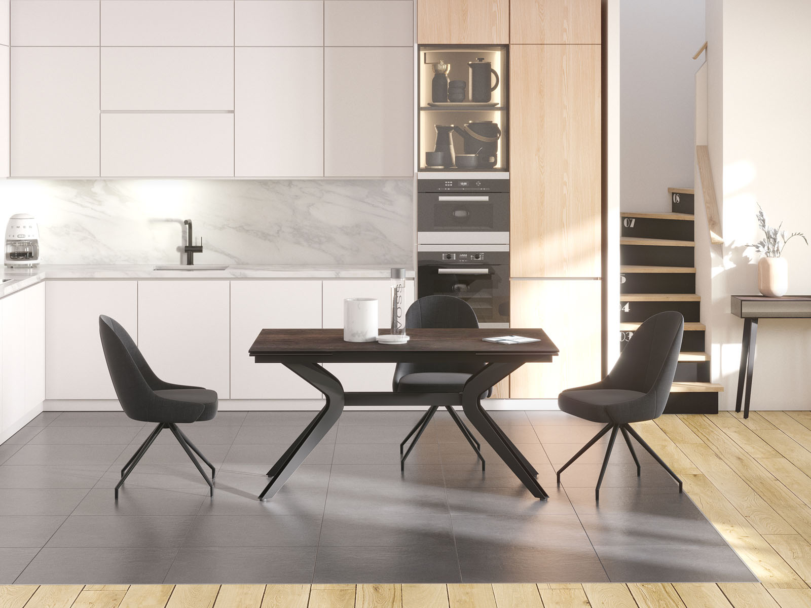 Cette grande table céramique se déploie aisément jusqu’à 270cm grâce à ses deux rallonges de 40cm en bout de table.