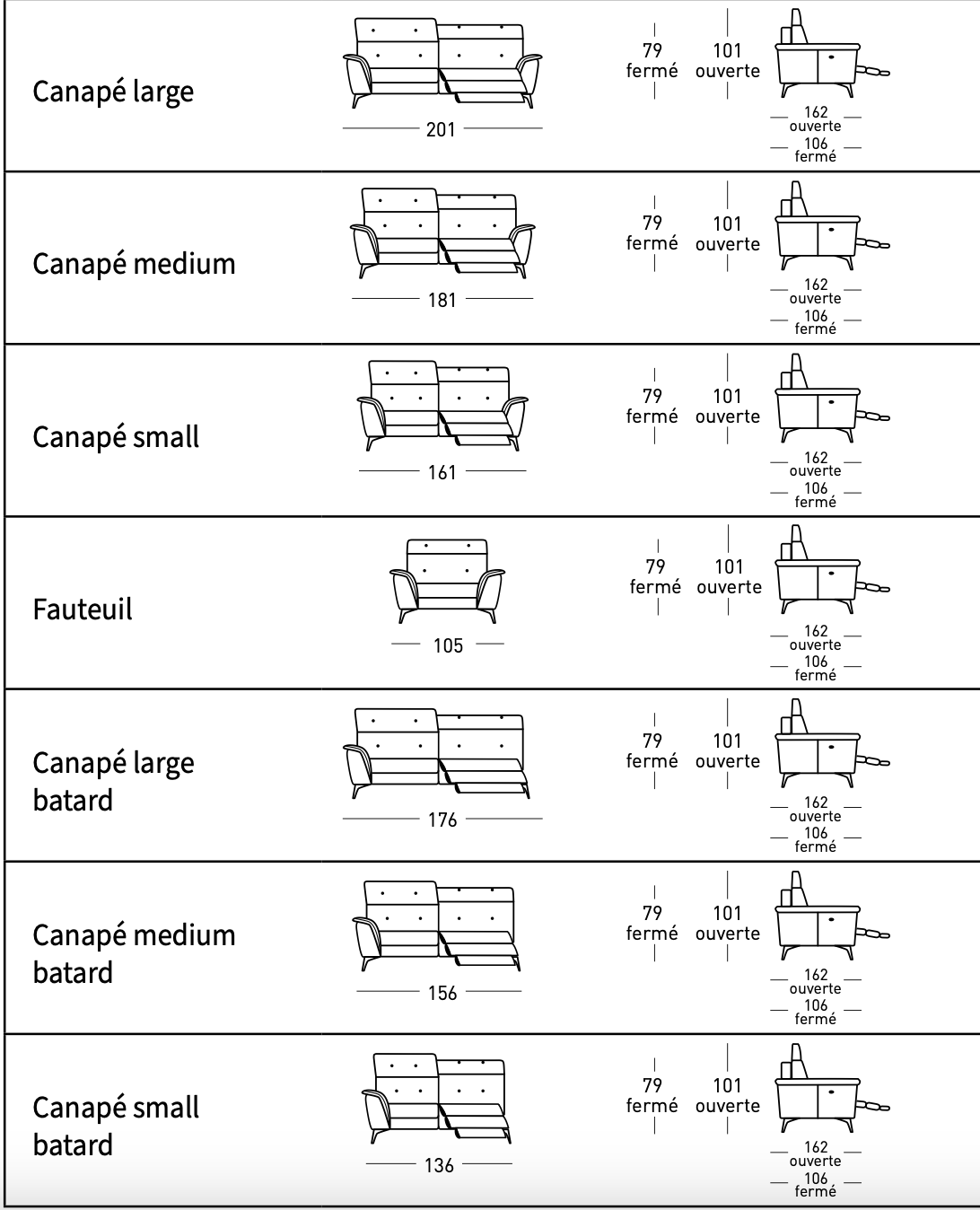 | Dimensions | Canapé large, Canapé medium, Canapé small, Fauteuil, Canapé large batard, Canapé medium batard, Canapé small batard |
